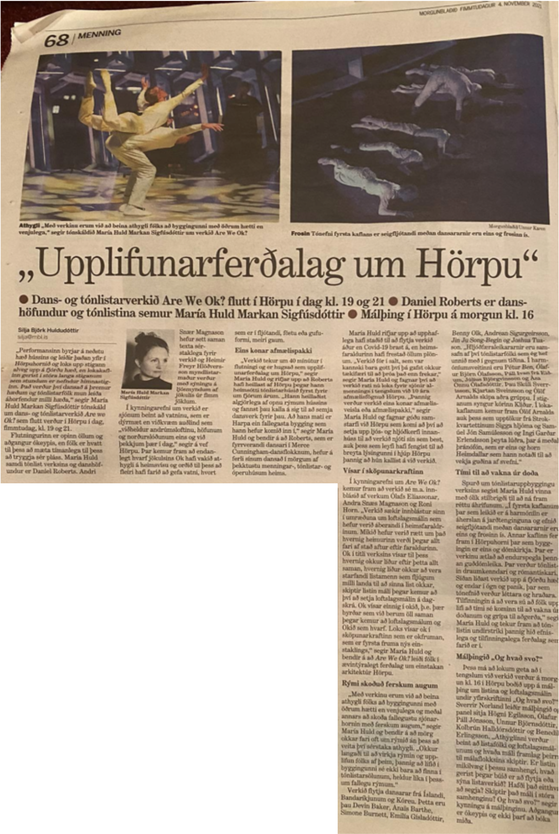 Are we Ok? will be performed by 8 dancers from Iceland, France, the USA and Korea, as well as over 20 international musicians. The piece takes 40 minutes in its entirety and will be performed twice on November 4, first at 19:00 and then again at 21:00. The performance is open to everyone, but we encourage those who are interested to arrive on time to secure a place.